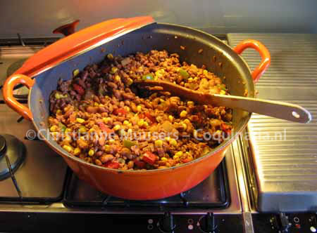 Er zijn heel veel versies van dit gerecht. Oorspronkelijk komt het uit Texas (eerste helft negentiende eeuw), waar het een goedkoop vleesgerecht met chillies (rode pepertjes) was. Dat kon je bij bonen serveren, maar bijvoorbeeld ook bij spaghetti of rijst. Als je voor bonen kiest, kun je gewone bruine bonen nemen. Authentieker is pinto bonen of kidney bonen te gebruiken, maar onderstaand recept heeft weinig met authenticiteit te maken, het is gewoon mijn recept van lang geleden. Overigens is de combinatie met bonen het beste als je het gerecht later wilt opwarmen, pasta of rijst moet je later apart toevoegen anders worden die te gaar.