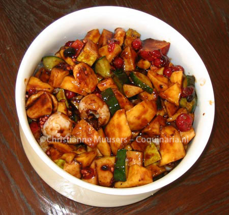 Dit is een pittige vruchtensalade voor bij de rijsttafel, dus niet een dessert! Ik serveer ook wel eens meloenbolletjes in roedjaksaus, als borrelhapje. Gebruik dan de halve hoeveelheid saus. Lekker bij babi ketjap.
