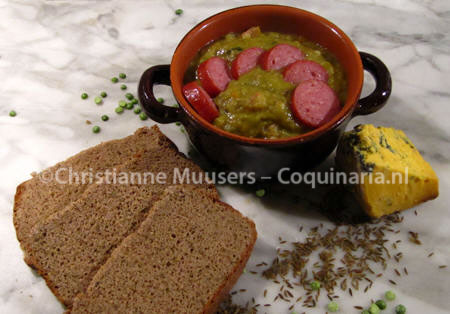 Bij erwtensoep dus, of bij lekkere oude kaas. Ik had toevallig nog Shropshire Blue in huis, een pittige blauwschimmelkaas, geweldige combinatie met dit komijnbrood! Kun je deze kaas niet krijgen, gebruik dan Stilton, of een overjarige Goudse als je niet van blauwschimmel houdt. Zelfs zachte smeerkaas smaakt er goed op.