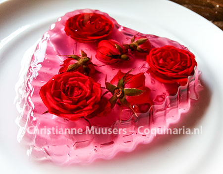 Eerlijk gezegd heb ik voor de foto gewone miniroosjes gebruikt, en die zijn waarschijnlijk niet eetbaar omdat ze met chemicaliën zijn behandeld. Daarom heb ik een tweede gelei zonder bloemen gemaakt die wel eetbaar is. De smaak is natuurlijk vooral zoet, dit gerechtje is een geintje.
