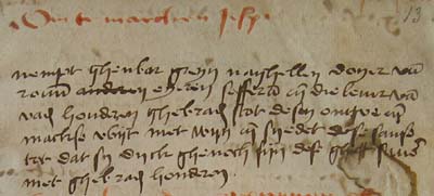 In the lefthand column is a translation in modern Dutch, in the righthand column you find a translation in English. The translations are working translations, not definitive versions. I have decided to add them anyway, to make the medieval text more accessible. The translations do not follow the syntax of the original to the letter, to be more easily read. Because this is not an annotated edition, I have not offered any arguments in the choice of specific translations. In a printed edition I hope to go more deeply into the meaning of individual words. In the mean time I welcome suggestions or differing opinions anyone has to offer.